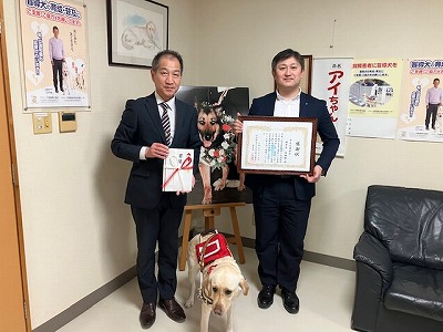 中日信用金庫様が当協会にお越しくださり、盲導犬育成事業に役立てていただければと、寄付金をご持参くださいました。