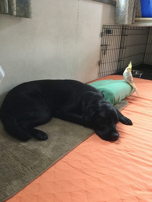 繁殖犬(お母さん犬)とインコさんの共演です(笑)…眠り猫のようですね!